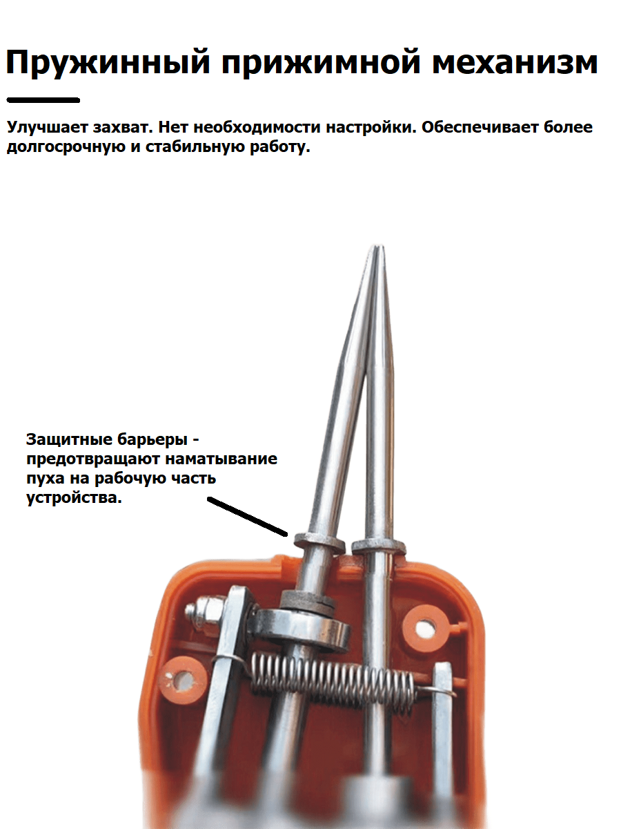 - Пружинные цанги сжимают щипцы аппарата по бокам, обеспечивая более надежный захват пуха и убирают необходимость настройки и подтяжки щипающей головки.